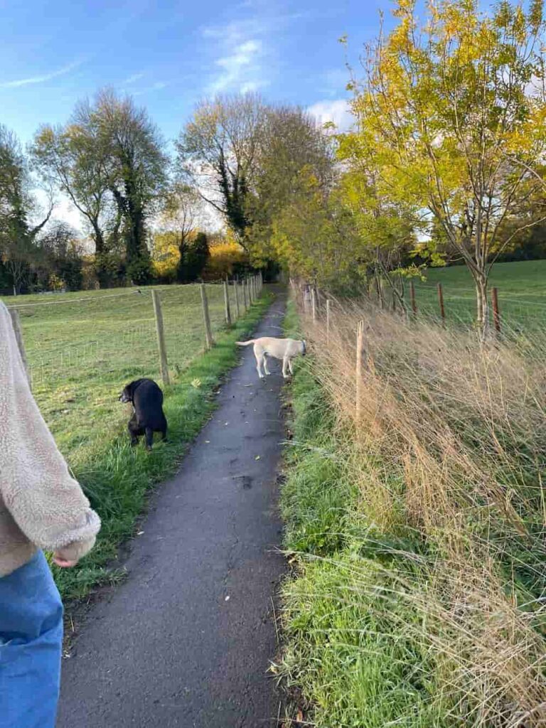 毎日朝と夕方に、犬とお散歩に出かけました。家から出ると、すぐ農場のウォーキングルートが始まり、運河の横を通り黄色と赤に紅葉した丘を歩くお散歩コースは、犬にとっても幸せな環境であり、リードなしでうれしそうに駆け回る親子の犬を見るのも微笑ましかったです。毎日天候に恵まれ、雨に降られることがほとんどなかったので、気持ちの良い秋の紅葉を十分に満喫できました。
